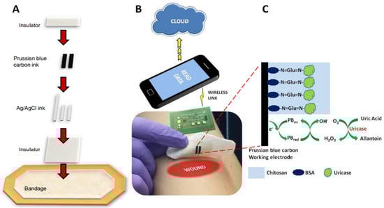 Biochemical sensors: (A). Screen printing the smart bandage. (B). Wearable potentiostat determining uric acid concentration and wirelessly communicating with a computer or smartphone. (C). Schematics showing amperometric detection of uric acid with uricase immobilized on a PB working electrode. Reprinted with permission from Electrochemistry Communications, Copyright 2015, [119].