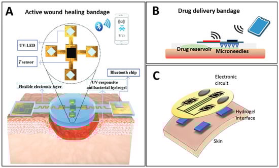 Responsive smart bandages with drug delivery capability by external and internal stimuli, (A). Externally triggered wound dressing: the on-demand release of therapeutic agents is activated through UV irradiation of a UV-responsive anti-bacterial hydrogel. Reproduced under the CC-BY license [83]. (B). Bandages-based drug delivery system layout. (C). Smart bandage with integrated biochemical sensors, stimulators and hydrogel interface for advanced wound care and accelerated healing.