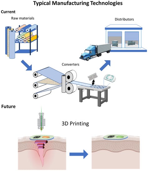 Three main stages in the typical industrial process. Manufacturers of raw material: adhesive layers, backing and barrier layers. Converters: combining the layers of raw materials, cutting by product size (manufacturing plans), sensor and electronics integration and packaging by order. Distributors: delivery directly to healthcare providers or pharmacies. 3D Printing: advancements in the manufacturing process of bandages and future use of 3D printing technology for direct deposition of both the bandage and electronics on skin.