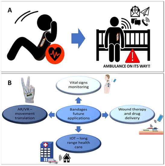(A). Future uses of bandage-based biosensors; the smart bandage detects a physiological disorder and directly contacts the healthcare provider. Exercising person silhouette downloaded from https://pixy.org/1104016/, accessed on 9 January 2023. (B). An overview of the future possible applications based on smart bandages for improved patient health analysis, and better support for medical staff requirements.