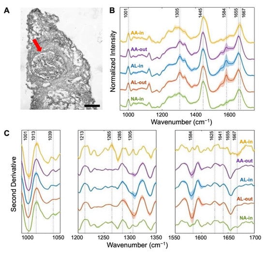 (A) Microscopic image of frozen kidney tissue identified with the glomerulus. Scale bar = 100 µm. (B) Averaged and normalized Raman spectra collected within and without glomeruli of AA, AL, and NA tissues with 1 standard deviation shaded. (C) Second derivative analysis of phenylalanine (1000–1500 cm−1), amide III (1200–1350 cm−1), and amide II-I (1550–1700 cm−1). Each spectrum in (B,C) is color-coded based on the type and deposition site and plotted in order, from top to bottom: AA-within glomeruli, AA-without glomeruli, AL-within glomeruli, AL-without glomeruli, and NA.