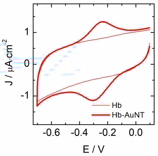 The presence of heme iron porphyrin in the structure of some proteins makes direct electron transfer possible through the heme Fe(III)/Fe(II) species. However, this reaction is slow due to the location of the electroactive group buried in the nonconductive peptide chains. The enhancement of this electron transfer process can be achieved by modifying the electrode surface [,] or by using composite materials that include the protein together with some conductive elements, as is the case of the gold nanoparticles forming nanobioconjugates []. In the present case, the strategy followed had been the preparation of the bioconjugates AuNT-protein that, upon stabilization, were deposited on a GC electrode surface by a drop casting methodology for electrochemical evaluation. Then, nanobioconjugates formed by AuNTs, with either Hb, Mb, or Cyt c, were checked for electron transfer capability. As it is shown in Figure 1, the presence of Hb-AuNTs bioconjugates on the electrode surface brings about the appearance of the Fe(III)/Fe(II) redox signal at −0.300 and −0.237 V, in contrast to the behavior observed when only Hb is deposited on the surface that shows no peak in the potential interval where the redox pair is currently observed.
