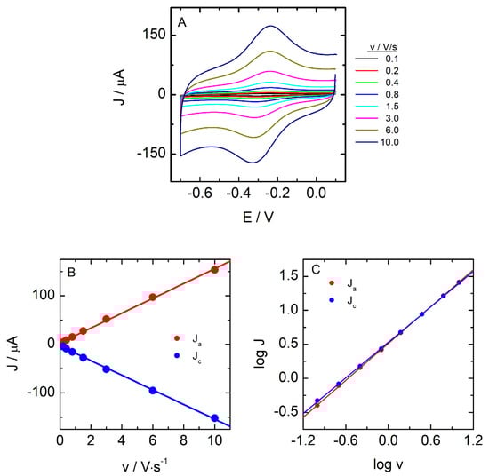 The cathodic and anodic peaks observed for Hb-AuNTs show a peak separation of 63 mV and an E°’ value of −0.268 V. When the cyclic voltammograms are recorded as a function of the scan rate, increases of the current density and peak potential separation are obtained (Figure 2A). The current increase with the scan rate shows a linear variation, indicating that the process is taking place on the surface, as is also evidenced by the logarithmic plot that gives slopes close to unity according to Equation (1) (Figure 2B,C).