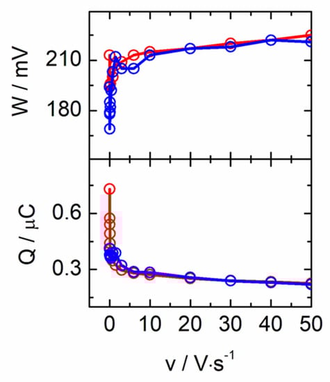In these systems, the charge involved in the electron transfer process can be determined from the integration of the voltammetric peaks upon background subtraction, and the results are plotted in Figure 3 as a function of scan rate, along with the values of the peak half width, W. The shape of the cathodic and anodic peaks of the voltammograms are nearly symmetric but present a half width higher than the theoretical value for an ideal process (90.6/n mV). This fact can be explained either as a consequence of the spatial distribution of redox centers in multilayers surrounding the nanoparticle [], or as a consequence of a heterogeneous population of proteins adsorbed in a non-uniform manner that gives rise to different adsorption environments and hence a distribution of different redox states [,,]. The W parameter presents a smaller value at low scan rates and suddenly increases, achieving a constant value at scan rates higher than 5 V/s. A parallel comportment to W can be observed in the charge involved in the anodic and cathodic processes that decrease to reach a constant value. This behavior has been seen in other systems and has been explained as due to the presence of protein multilayers adsorbed on the surface of the electrode and that, only at low scan rates, they can undergo the redox process efficiently. However, when the scan rate increases, the charge density decreases until it reaches a constant value, evidencing that the electron exchange only occurs with the protein layers closest to the electrode surface []. Based on the above, an analysis of the situation can be made, considering the Equation (2), which allows determining the surface coverage (Γ) if the charge involved (Q) and surface area (A) are known.