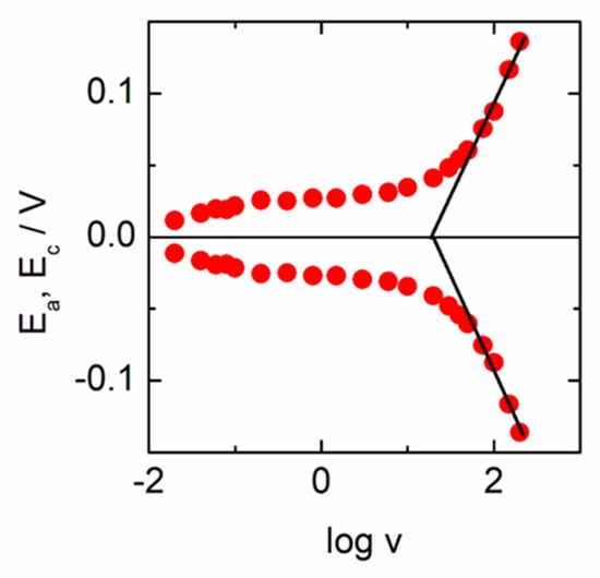 As seen in Figure 4, the peak potentials for the Hb-AuNTs shows a small separation of peaks at a low scan rate, which increases slightly up to the change, becoming more important at very high scan rates showing two branches that seem to retain some symmetry with respect to the values of the average potentials (Figure 4). Under these conditions, it is possible to determine both the values of α and ks based on the Laviron method [,]. At high speeds, the values of Ep vary linearly with log v and, since these branches reach values of ΔE > 200/n mV, the Equations (3)–(5) can be used to determine the α and ks parameters.