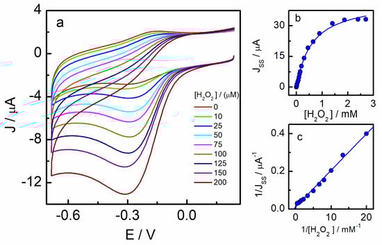 Taking into account the redox response of the nanobioconjugates, it seems interesting to check their capacity as sensor systems against some molecules, such as H2O2 [,,], NaNO2 [,], and O2 [,], that have been shown to be catalyzed by these proteins under determined conditions. Figure 5 shows the voltammograms of the Hb-AuNT deposited on a GC electrode obtained in solutions with increasing amounts of H2O2 in a phosphate buffer at pH 7.4. It is observed that the reduction current gradually increases, while the oxidation rate decreases until finally disappears. This behavior is typical of electrocatalytic systems, in which the reduced state of Hb that is generated is immediately oxidized with the H2O2 present in solution. While in the absence of H2O2, the voltammogram presents characteristic redox peaks of Hb at E°’ of −0.268 V; the addition of hydrogen peroxide results in a current increase of the Hb-Fe(III) reduction peak, concomitant with the decrease; and finally the disappearance of the Hb-Fe(II) oxidation peak intensity. Such behavior indicates that this platform functions as a biosensor and shows excellent electrocatalytic activity towards H2O2 reduction []. The cathodic current (measured at a constant potential of −0.30 V) increases linearly with the analyte concentration until c.a. 500 μM. Up to this value, a constant intensity current is assessed—that is, reaches a plateau—characteristic of the Michaelis–Menten mechanism. The apparent Michaelis–Menten constant (KMapp) is a reflection of the analyte-substrate kinetics, and it can be obtained from the electrochemical version of the Lineweaver–Burk equation (Equation (6)),