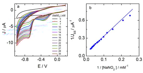 (a) Cyclic voltammograms for the electrocatalytic response of the Hb-AuNTs system for nitrite ions detection. The voltammograms were recorded after multiple standard additions of NaNO2 solution to a 10 mM phosphate buffer solution at pH 5; (b) Lineweaver–Burk plot.