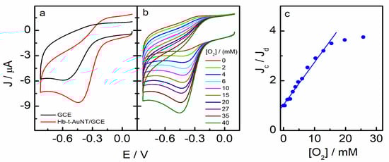The catalytic efficiency is expressed as the ratio of the reduction peak current in the presence (Jc) and absence of oxygen (Jd). We have plotted the ratio Jc/Jd against the O2 concentrations monitored, and a linear behavior had been obtained with slopes of 79, 88 and 170 M−1 for Cyt c-, Mb-, and Hb-AuNTs bioconjugates, respectively. These values can be correlated with the sensitivity of these platforms to O2 electrocatalysis.