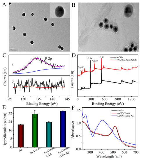 TEM image of (A) AuNPs. (B) Ag-deposited TAMRA-OTAApt@AuNPs; outer scale bars = 50 nm and inner scale bars = 5 nm. (C) The narrow-scan P 2p XPS (a) after and (b) before the aptamer was conjugated on the AuNPs. (D) XPS survey of AuNPs, and Ag-deposited TAMRA-OTAApt@AuNPs. (E) The hydrodynamic sizes of AuNPs, TAMRA-OTAApt@AuNPs, OTA/TAMRA-OTAApt@AuNPs, Ag-deposited TAMRA-OTAApt@AuNPs. (F) UV-vis spectra of AuNPs (black line), TAMRA-OTAApt@AuNPs (red line), and Ag-deposited TAMRA-OTAApt@AuNPs (blue line).