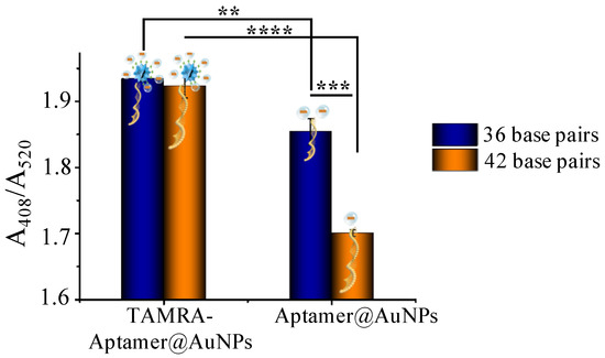 Relative absorbance of silver deposition catalyzed by AuNPs conjugated with aptamers with 36 and 42 base pairs. ** denot p < 0.01, *** denot p < 0.001, **** denot p < 0.0001.