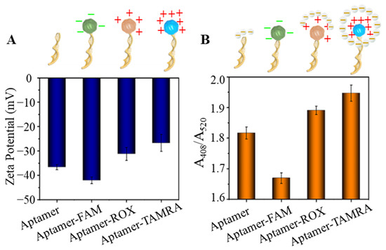 (A) Zeta potential of aptamer@AuNPs tagged with different molecular tags. (B) relative absorbance (A408/A520) changes induced by aptamer@AuNPs tagged with different molecular tags. FAM: fluorescein amidites, ROX: 6-carboxy-x-rhodamine, TAMRA: tetramethylrhodamine.