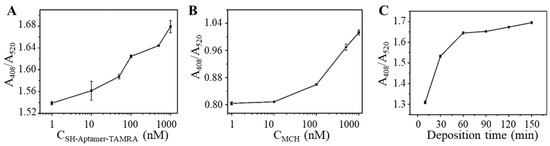 To achieve sensitive and fast OTA detection, parameters involved in the detection process were optimized to increase sensitivity and maximize the efficiency of the aptasensor. First, the concentration of TAMRA-OTAApt-SH in preparing TAMRA-OTAApt@AuNPs conjugates was optimized. It can be seen from Figure 4A that as the concentration of TAMRA-OTAApt-SH increased from 1 to 1000 nM, the absorbance ratio of A408/A520 response gradually increased. Therefore, 1000 nM TAMRA-OTAApt-SH was used to construct the OTAApt@AuNP-based aptasensor. Next, MCH was used to block the unoccupied sites on the TAMRA-Aptamer@AuNP surface. It was reported that MCH could prevent AuNP aggregation [37], thus ensuring the stability of AuNP solutions. As shown in Figure 4B, TAMRA-Apt@AuNP passivated by 1 μM MCH delivered the highest absorbance ratio of A408/A520, suggesting an improved Ag deposition. Finally, the Ag deposition time was optimized. As shown in Figure 4C, the absorbance ratio of A408/A520 gradually increased as the deposition time increased from 15 min to 60 min. Further extension of the deposition time did not result in signal enhancement. Thus, the Ag deposition time was set as 60 min.