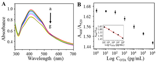 With the optimized parameters, the TAMRA-OTAAPT@AuNP-conjugates were prepared for OTA testing. The TAMRA-OTAAPT@AuNP was mixed with different concentrations of OTA and incubated for 30 min at 37 °C. As shown in Figure 5A, the UV-vis absorption gradually decreased as the concentration of OTA increased. The calibration curve of absorbance intensity (A408/A520) vs. OTA concentrations is shown in Figure 5B. The absorbance ratio of A408/A520 was proportional to the logarithm of OTA concentration and within a concentration range of 1 × 102 to 1 × 106 pg mL−1. Therefore, we obtained a linear equation expressed as A408/A520 = 1.739 − 0.04456 log COTA with the correlation coefficient R2 = 0.995. According to reported colorimetric aptasensors [38,39], the limit of detection (LOD) of 28.18 pg mL−1 was calculated as 3 times the standard deviation (s.d.) of the blank sample signal (s.d. = 2.48 × 10−2) divided by the slope of the regression equation (slope = −0.04456). On this basis, a colorimetric detection method for OTA has been successfully constructed. The merits and novelty of this work lie in the charged molecular tag, TAMRA, that enriches the local silver lactate concentration to facilitate AuNP-catalyzed silver reduction to produce visual colorimetric changes. The analytical performance of the TAMRA-OTAAPT@AuNP-based aptasensor was compared with previously reported colorimetric OTA biosensing (Table 1). The proposed TAMRA-OTAAPT@AuNPs-based aptasensor achieved a broader working range and comparable detection limit. In addition, the solution reaction system combined with the AuNP-catalyzed silver enhancement eliminates the need to separate bound and unbound molecules in the reaction system, thus significantly simplifying the overall reaction procedure.