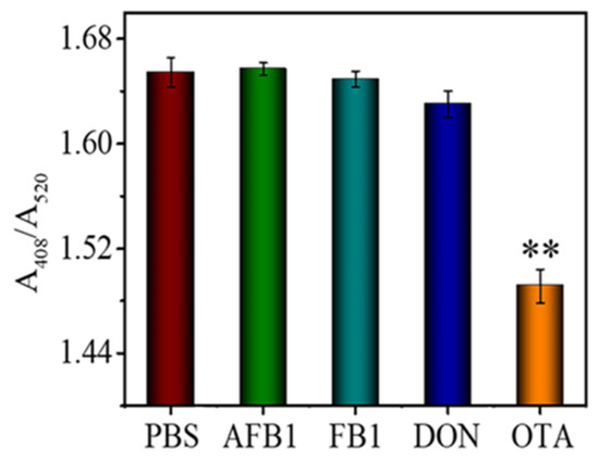 Specificity is of great importance for sensor applications. To investigate the specificity of the developed aptasensor, AFB1, DON, and FB1 were analyzed as interfering substances (Figure 6). The more robust silver enhancement-induced colorimetric change was observed from FB1, AFB1, and DON samples. This is because the TAMRA-OTAApt immobilized on the AuNPs stretched in the solution, while the TAMRA molecules attracted silver lactate to increase the probability of AuNP-catalyzed Ag deposition. The OTA sample gave the lowest absorbance (A408/A520) change (Figure 6; p < 0.01). The results demonstrate that the colorimetric aptasensor has good specificity and selectivity for OTA detection.