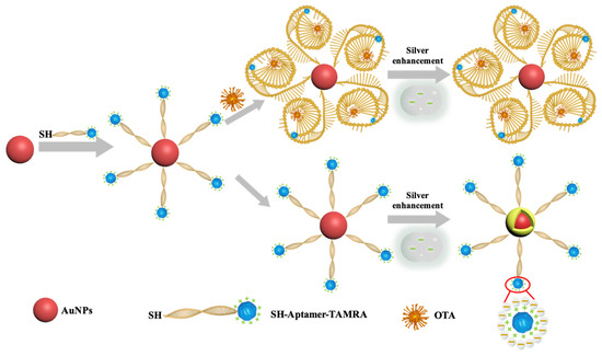 Silver enhancement, a procedure for electroless silver deposition, has been used for immunoassays to increase the signal readout. Wang et al. reported an aptamer-based PDMS-gold nanoparticle composite aptasensor and discussed the electrostatic repulsion effects between the negatively charged aptamer and silver lactate on silver enhancements [27]. In previous studies, gold nanoparticles (AuNPs) have been used to catalyze silver reduction on silicon chips [28], glass surfaces [29,30], gold electrodes [31], paper [32], and poly(dimethylsiloxane) (PDMS) [27,33]. In those detection schemes, the AuNP-labeled probes (antibodies or aptamers) were captured on a solid surface, while the unbonded AuNP-labeled probes were removed by washing steps. Thus, washing steps were critical to separate reacted and free AuNPs-labeled probes. During the silver enhancement process, the effective component of the silver enhancement kit is the negatively charged silver lactate. This electron-rich molecule acts as a metal ligand to bind silver ions through coordination [27]. As illustrated in Scheme 1, the AuNPs catalyze silver reduction and act as the nuclei for silver precipitation. In this study, we developed a silver enhancement-based aptasensor for detecting OTA. The 3′-end and 5′-end of the OTA aptamer were tagged with a thiol group (-SH) and a molecular tag tetramethylrhodamine (TAMRA), respectively. As the TAMRA molecule is positively charged, the silver lactate should be attracted and retained around the AuNPs by the TAMRA [34], thus increasing the efficiency of the AuNP-catalyzed silver reduction. In the presence of OTA, the OTA aptamer bound and enwrapped the OTA. The conformation changes of the aptamer formed a barrier to cover TAMRA, thereby interrupting the electrostatic attraction between TAMRA and silver lactate, eventually inhibiting the AuNP-catalyzed silver reduction. The increased barrier of the OTA aptamer complex covering the AuNPs further hindered the interaction between AuNPs and silver lactate. Both effects ultimately reduced the probability of AuNP-catalyzed silver reduction (Scheme 1). With the optimized aptamer concentration and reaction time, the analytical performance of the TAMRA-assisted OTA aptasensor was studied. The potential application of the proposed aptasensor was validated by testing trace OTA spiked in peanuts, corn, and soybean extracts.