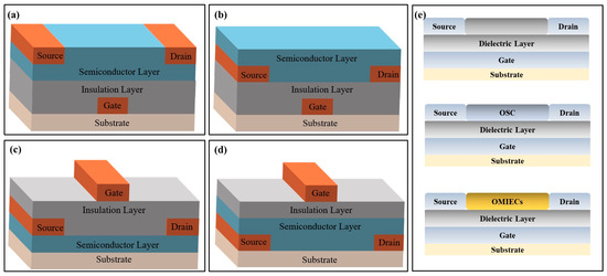 Structural diagrams of transistor-based biosensors. (a) Bottom-gate/bottom-contact transistor-based sensor. (b) Bottom-gate/top-contact transistor-based sensor. (c) Top-gate/bottom-contact transistor-based sensor. (d) Top-gate/top-contact transistor-based sensor. (e) Schematics of three transistor-based biochemical sensors.
