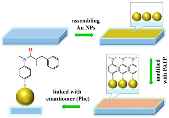 The Au NPs were synthesized by the reduction of HAuCl4 with trisodium citrate, as previously described in the literature [31]. The Au NPs substrates were prepared by the self-assembly of Au NPs on the surface of a hydroxylated ITO-coated glass based on electrostatic interaction. The hydrophilic treatment of ITO glass substrates was performed by using an aqueous solution containing ammonium hydroxide and hydrogen peroxide [32]. Furthermore, the hydroxylated ITO glass was immersed in PDDA solution for 30 min for surface charge modification. After being rinsed and dried, the positively charged PDDA was adhered to the surface of the ITO glass, which could adsorb the negatively charged Au NPs by being soaked in the colloidal Au NPs. A layer of Ag NPs was assembled on the surface of ITO glass slide and the Au NPs substrates were complete. The prepared Au NPs substrates were immersed in an ethanol solution of 10−2 M PATP for 2 h, and then rinsed by ethanol and dried by nitrogen. After the surface functionalization of the Au NPs substrates with PATP, the achiral Au/PATP substrates were achieved.