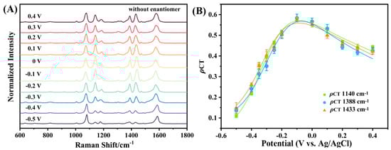 (A) Normalized potential-dependent SERS spectra of the Au/PATP substrate without any enantiomers. The applied potential is from −0.5 to 0.4 V. (B) ρCT profiles of 1140, 1388, and 1433 cm−1 bands of PATP in the Au/PATP system.
