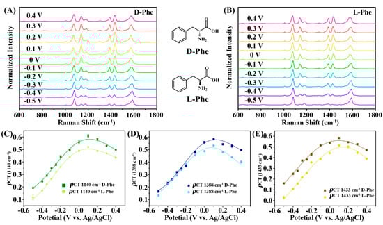 Electrochemical potential-dependent SERS spectra of the Au/PATP substrate with and without Phe enantiomers were recorded under different applied potentials from −0.5 to 0.4 V with a potential interval of 0.1 V, which does not cause either the redox reaction or the desorption of the adsorbed PATP on the electrode. As shown in Figure 4, the SERS intensity of each system changed with the applied potential from the negative to the positive potential. The intensities of the b2 modes of PATP in the Au/PATP system increased first as the potential reached −0.1 V potential, and then decreased with the regulation of the applied potential to 0.4 V (Figure 4A). While no considerable change in the intensity of the a1 mode was observed in this potential region (Figure S3), this indicated that the molecular orientation of the adsorbed PATP in the systems was not significantly affected by the applied potential [39]. The potential-dependent changes in the SERS intensity of the Au/PATP electrode may originate from the change in the Au/PATP interfacial interaction and the Fermi level of the Au NPs substrates. The corresponding ρCT values of the Au/PATP system under the influence of electrode potential were plotted in Figure 4B. An asymmetric, potential-dependent ρCT profile of the 1140, 1388, and 1433 cm−1 bands of PATP in the Au/PATP system was obtained. Such an asymmetric curve of ρCT versus potential as a result of Fano interference is regarded as the characteristic feature of CT enhancement [40,41].