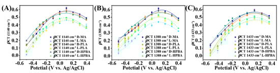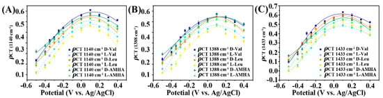 Compared ρCT profiles of (A) 1140, (B) 1388, and (C) 1433 cm−1 bands of PATP in the three aliphatic enantiomeric discrimination systems.