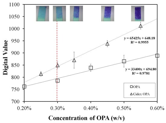 3.8. Performance Verification by Comparison with Cidex-OPA and Reference OPA