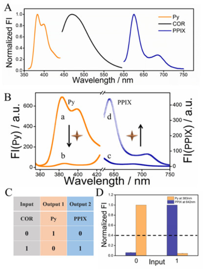 Furthermore, a molecular logic operation was integrated with the ratiometric fluorescent detection of COR for the first time. It should be noted that the detection was achieved under the control of a “YES-NOT” contrary logic pair, enabling the smart logical analysis of COR via the dual-channel response with high reliability and accuracy. As shown in Scheme 1, Figure 1C,D, two ssDNAs were taken as the platform of the logic device. COR was used as the input (absence “0,” presence “1”), and the fluorescence signal of Py monomer and PPIX were two contrary outputs (low “0,” high “1”). In the absence of COR, the high fluorescence signal of Py (F383) and low one of PPIX (F642) corresponded to the output “1-0”. Meanwhile, in the presence of COR, the resulting low signal of Py (F383) and high one of PPIX (F642) corresponded to the output “0-1”. This phenomenon featured the characteristics of the “YES-NOT” contrary logic pair properly, which can be further identified by the fluorescent column bars in Figure 1D, in which the threshold value was set at 0.40 to distinguish the positive/negative outputs. According to the truth table (Figure 1C), the existence state of COR can be easily identified, endowing the following COR detection with the accuracy and reliability of dual-output Boolean logic.