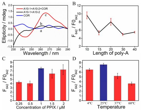 (A) CD spectra of (a) solely COR and A10 strands in the (b) absence and (c) presence of COR; (B) Optimization of the length of poly−A; (C) Optimization of the concentration of PPIX; (D) Optimization of the reaction temperature. The error bars are obtained via three independent experiments.