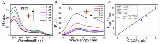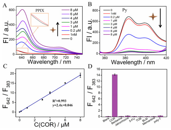 (A) Fluorescence spectra of PPIX in the presence of various concentrations of COR by using 1% FBS as the reaction solution; (B) Fluorescence spectra of Py in the presence of various concentrations of COR by using 1% FBS as the reaction solution; (C) Linear relationship between the F642/F383 ratio and COR’s concentrations in the range from 100 nM to 8 μM by using 1% FBS as the reaction solution. The error bars are obtained via three independent experiments.