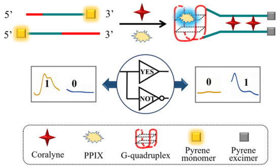 The ratiometric fluorescence technique records the ratio of fluorescence values at two distinct wavelengths, and this strategy could perform cross-verification of the detection results via the concurrent positive and negative signals, which significantly improves the reliability while reducing potential background/environmental interferences [38,39]. Furthermore, molecular logic gates, with the unique advantages of accuracy, intelligence, and a binary-encoded digital output, have aroused scientists’ widespread interest and are widely applied to smart sensing, biomedical diagnosis, therapy, and other research fields [40,41,42,43,44]. For instance, Fan et al. proposed the concept of the DNA “contrary logic pair” (CLP, two parallel logic gates with opposite functions) and designed a universal system for operating various CLPs successfully [45]. It should be emphasized that the dual-channel mode of CLPs can not only bring a rigorous and intuitive digital output, but also significantly enhance reliability and accuracy, providing an elegant way to break the bottlenecks of current COR sensors [46,47,48,49]. However, as far as we know, ratiometric fluorescence has not been introduced into the analysis of COR, let alone the combination of COR detection with molecular logic computing. Against the above background, establishing a ratiometric fluorescent platform that controls by contrary logic pair (CLP) for highly sensitive and selective detection of COR is urgently needed.