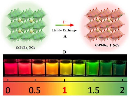 Generally, colorimetric sensing provides more convenient and sensitive approaches compared with those based on the luminescence intensity change because the human eye exhibits higher sensitivity to color changes. Recently, colorimetric sensing studies and applications of CsPbBr3 perovskite nanocrystals (CsPbBr3 NCs) have drawn researcher attention [18]. CsPbBr3 PNCs exhibit excellent luminescence properties, such as high quantum yield, narrow full width at half maximum (FWHM) [19,20] and ion exchange [21]. They have been widely used in solar panels [22], light-emitting diodes [23,24], laser fields [25], UV blocking [26], and have revealed excellent application prospects in the field of sensing [18,27,28,29]. The change in the proportion of halogen ions in the CsPbBr3 NCs structure will cause the change in their fluorescence emission wavelength, as shown in Figure 1A, which will cover the whole visible spectrum region and produce a significant color change from blue to red. The above phenomena are very beneficial for the establishment of wavelength-shift-based colorimetric sensing without any additional materials. Recently, several colorimetric sensing studies have been reported using the wavelength-shift of the halogen exchange characteristics of CSPbX3 NCs, in which the concentrations of Cl− and methylamine (MA) gas, as well as the peroxide number of edible oil, have been detected [18,29,30,31]. In addition, based on the similar consideration, colorimetric sensing approaches have been developed for the determination of chlorine, iodine and other trace elements in tap water [32], H2S in rat brain microdialysate [27] and benzoyl peroxide in flour and noodle samples [33].