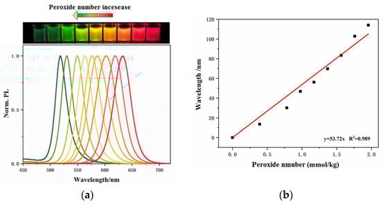 A colorimetric sensing method using CsPbBr3 NCs was established to detect the peroxide number of a milk powder sample based on the above optimized conditions. In the experiment, a series of extract standard samples with different peroxide numbers was prepared following the procedures as described in Section 2.4. The corresponding peroxide numbers of the above standard samples were determined according to ISO 3976:2006. Using the standard samples, the corresponding PL wavelength shift for their different peroxide numbers could be obtained by CsPbBr3 NCs colorimetric sensing method. As shown in Figure 3, the blue shift of the PL wavelength of CsPbBr3 NCs coincides with the peroxide number increase in the standard sample because the higher content of peroxides (larger peroxide number) consumes more I− from OLAM-I, which reduces the halogen exchange with CsPbBr3 NCs. Correspondingly, the color presented from red, orange, yellow, green yellow, and finally to light green as shown in Figure 3a (the up figure). The relationship between the quantitative peroxide number of the standard samples and their corresponding maximal PL wavelength is listed in Table S2. The maximal PL wavelength was found to be 633 nm when the peroxide number was 0. With the increase of the peroxide number to 1.96 mmol/kg, the maximal PL wavelength shifted to 519 nm. As shown in Figure 3b, the peroxide number of the standard sample presented a good linear relationship in the range from 0.02 mmol/kg to 1.96 mmol/kg with the PL wavelength shift, and the linear regression equation of y = 53.72x (y, wavelength shift, x, peroxide number) with a correlation coefficient (R2) of 0.989 could be obtained. The limit of detection (LOD) of the peroxide number is 3 μmol kg−1 (LOD = 3σ/k, k = 53.72, the slope of linear equation, σ is relative standard deviation).