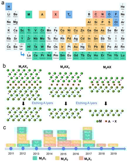 (a) Periodic table with MAX phases and MXene compositions. (b) The schematics of etching MAX phases as the precursor of three typical MXenes, including M2X, M3X2, and M4X3 MXene. (c) Timeline of progress in MXene synthesis.