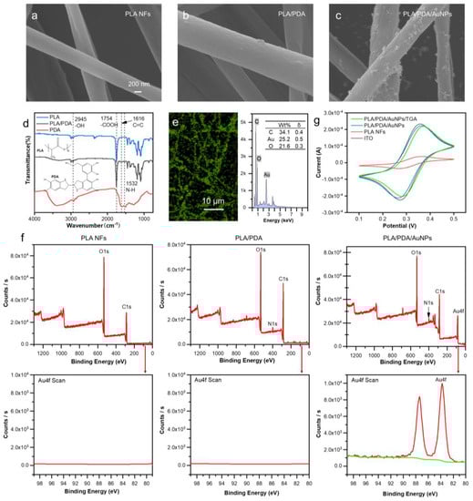 Additionally, as shown in Figure 2d, after modification with PDA, catechol and amine functional groups were introduced onto PLA NFs, which was conducive to the subsequent modification [41]. As shown in Figure 2e, the fiber surface was covered with gold elements after growing AuNPs in situ, demonstrating the successful gold coating and providing sufficient reaction sites for the grafting antibodies by Au-S bonding. According to further XPS analysis of the elements on the fiber surface (Figure 2f), both the PLA/PDA and PLA/PDA/AuNPs nanofibers displayed N1s peaks, and the PLA/PDA/AuNPs nanofiber displayed Au binding energy at 84 eV. The results mentioned above demonstrated that the PLA/PDA/AuNPs nanofiber surface was successfully coated with gold. The conductivities of fibers at different stages were further characterized by cyclic voltammetry. The ITO substrates covered with different nanofibers were attached to the working electrodes and immersed in K3[Fe(CN)6] electrolyte for voltammetric testing. The results (Figure 2g) showed that the conductivity of the ITO substrate reduced after the deposition of PLA NFs, which was nearly restored after the modification with PDA and AuNPs. These results suggested that the introduction of Au-endowed PLA NFs with good conductivity. In addition, after further TGA modification, the cyclic voltammograms (CV) curves only showed a slight decrease in conductivity. To eliminate the interference of the ITO glass itself and further confirm the TGA modification, the CV curves of fibers on ordinary glass substrate were also tested, as shown in Figure S3. The CV curve displayed that the current was decreased after the introduction of TGA because the TGA may hinder electron transfer [32]. These results indicated that the TGA was successfully modified onto the surface of PLA/PDA/AuNP nanofibers.
