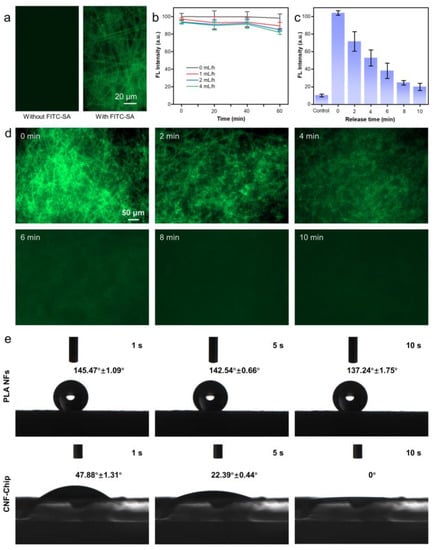 Biofunctionalization and characterization of the CNF-Chip. (a) Fluorescent images of PLA/PDA/AuNPs without and with FITC-SA. (b) Fluorescence intensity of the AuNPs-coated nanofibers with FITC-SA under different flow rates. (c) Fluorescence intensity of the AuNPs-coated nanofibers with FITC-SA after applying voltage for different times. (d) Fluorescent images of FITC-SA modified nanofibers after electrochemical release for 2, 4, 6, 8, and 10 min, respectively. (e) The water contact angle of PLA NFs and CNF-Chip.