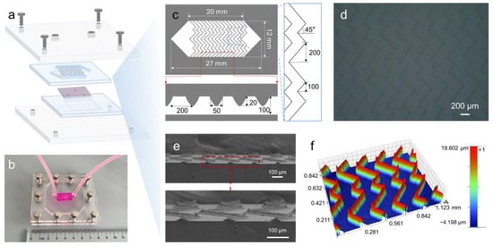 Preparation and characterization of the microchannel. (a) Schematic illustration of CNF-Chip-embedded microfluidic device. (b) Photograph of the CNF-Chip-embedded microfluidic device. (c) Schematic illustration for parameters of the herringbone microchannels. (d) Photograph of PDMS microchannel of the device. (e) SEM images of the herringbone micropattern cross-section. (f) The 3D imaging of the herringbone microchannel lid shows the height at 20 μm.