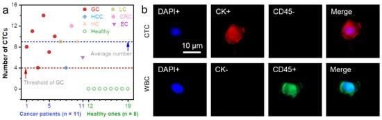 To test the performance of the CNF-Chip-embedded microfluidic device on clinical samples, blood samples from eight healthy volunteers and 11 patients with different cancers at various stages were collected and used. The basic clinicopathological data are shown in Table S3. Considering the interference of the large number of WBCs in the blood sample, CNF-Chip was blocked with BSA before CTC capture and tested by the blood sample from one healthy volunteer, as shown in Figure S8. The results showed that after BSA blocking, the number of WBCs significantly decreased. For blood samples from patients, the captured cells on the CNF-Chip were subjected to three-color immunofluorescence staining. The DAPI+/CK+/CD45- cells were defined as tumor cells, and DAPI+/CK-/CD45+ cells were defined as WBCs [49]. Based on this standard, the CTCs isolated respectively from those 19 blood samples were stained and analyzed, as shown in Figure 7a and Table S3. A representative fluorescent image of captured cells from patient No. 9 was shown in Figure S9, indicating that the rare CTC could still be captured from the blood. The labeled CTC and one randomly picked WBC were zoomed in, as shown in Figure 7b. It suggested that no CTCs were found in the blood samples from eight healthy volunteers, while different amounts of CTCs were detected in blood samples from six gastric cancer (GC) patients, a lung cancer (LC) patient, a hepatocellular carcinoma (HCC) patient, a colorectal cancer (CRC) patient, a hilar cholangiocarcinoma (HC) patient, and an endometrial carcinoma (EC) patient, respectively. The threshold number of CTCs was significantly correlated with clinical stage III-IV gastric cancer [50]. Our results showed that the mean number of CTCs in patients with gastric cancer was nine, and all patients with stage III-IV gastric cancer had a number of CTCs ≥ 4 cells/mL. In addition, the overall average CTC number of all the cancer patients was around nine. Though more clinical samples should be detected to confirm the sensitivity, those results still suggested that the CNF-Chip-embedded microfluidic device had excellent potential for clinical applications in CTCs isolation and analysis.