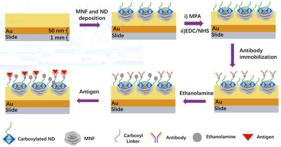 Figure 1 shows the modification process and detection diagram. The chip coated with MNF and ND was first incubated in PBS solution for 30 min to soak the chip surface. Then, 10 mM MPA solution was used to replace PBS and incubated for about 60 min. The MPA was washed away by PBS, and then the EDC/NHS (1:1 v/v) mixture was added to the chip to activate the carboxyl groups on the gold surface. Afterward, 150 μg/mL antibody solution was incubated on the chip surface for 120 min and then washed with PBS. In the cases of IgG and PRV detection, the goat-anti-mouse IgG and PRV antibodies were employed, respectively. The chip was specifically functionalized as a result. Finally, 1 M of ethanolamine solution was added to occupy the remaining blank sites, suppressing nonspecific binding in the following detection process.