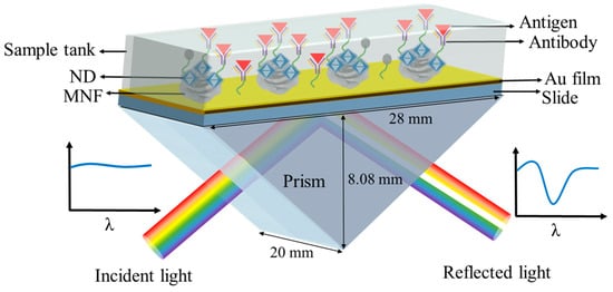 A combination of 3-mercaptopropionic acid (MPA), N-hydroxysuccinimide (NHS), 1-ethyl-3-(3-dimethylaminopropyl) carbodiimide (EDC), and ethanolamine were utilized to chemically modify the surface of SPR chip. Hexaammonium heptamolybdate tetrahydrate ((NH4)6Mo7O24·4H2O) and thiourea (CH4N2S) were used to synthesize MNF. The materials mentioned above were brought from the Shanghai Aladdin Company. Carboxylated NDs with an average size of 35 nm were purchased from the Taiwan FND Biotech Company. PBS was purchased from the Shanghai Sangon Biotech Company. Goat-anti-mouse IgG, mouse IgG, rabbit IgG, and bovine IgG were purchased from the Beijing Biosynthesis Biotechnology Company. PRV, PRV antibody, and pig serum samples were extracted from samples collected on the farm. PRV and PRV antibodies were dissolved in a mixture of pig serum and PBS (3:100 v/v). IgG reagents, PRV, PRV antibody, and serum sample were stored at −20 °C, and other reagents were stored at −4 °C.