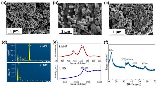 MNF and ND are characterized by scanning electron microscope (SEM), X-ray photoelectron spectroscopy (XPS), Raman spectrometer, and X-ray diffraction (XRD). The SEM image of MNF (Figure 3a) shows the petal-like morphology exposing more faces and edge sites. The particle size of nanoflowers is about 0.5–1 µm. NDs in the SEM image (Figure 3b) show a polyhedron morphology, and the particle size ranges from 30 to 300 nm due to a certain degree of agglomeration. The SEM image on the chip surface deposited by the mixture of nanoflowers and NDs (Figure 3c) indicates that the gap between petals is occupied by NDs. The element composition of materials is demonstrated by XPS (Figure 3d). It also reveals that MNF contains a small number of impurity elements, such as Al and Cu, and ND contains oxygen elements due to the carboxyl functional groups on its surface. Besides, two Raman peaks at 378 cm−1 and 403 cm−1 can be observed for MNF (Figure 3e(i)), which is consistent with what has been reported in other articles [], and one observed peak for NDs is located at 1431 cm−1 (Figure 3e(ii)). The measured diffraction peaks of MNF in the XRD spectrum (Figure 3f) are matched with the standard pattern of hexagonal MoS2 (JCPDS card No. 73-1508) []. The intensity ratio of diffraction peak (100) to (002) is 0.51, which means a large number of crystal faces (100) nanoflowers are exposed [].