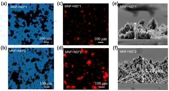 Characterization of sensor chips. (a,b) Optical microscope images, and (c,d) Corresponding fluorescent images on the chip’s surface deposited with MNF + ND*1 and MNF + ND*2, respectively. The NDs used in our experiments contain a nitrogen vacancy (NV) center, which emits red fluorescence under the excitation of green light []. This enables us to evaluate the amount of NDs modified on the chip surface based on the fluorescence intensity. (e,f) SEM images of chips interface from the side view.