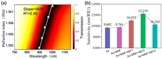 SPR chips were fabricated on tailored silica slides at 28 × 20 × 1 mm (Jiuyi Optics, Fuzhou, China). The slides were first washed several times with deionized water and absolute ethanol. We have investigated the effect of gold film thickness [] on the performance of SPR sensors, and according to the relevant results, the best performance of SPR sensors was obtained with a gold film thickness of 50 nm. So, a 5 nm thickness chromium layer and a 50 nm gold layer were successively coated on the slide surface by vacuum thermal evaporation, where the chromium layer was used to strengthen the adhesion of the gold layer on the slide. According to our previous related work [], continued deposition of ND on a chip deposited once with MoS2, the MNF and ND dispersion solutions with the respective concentrations of 0.025 mg/mL and 0.05 mg/mL were prepared in ethanol/water (1:1 v/v) solvent with the aid of sufficient sonication for at least 30 min. Then a 200 μL MNF or ND dispersion solution was deposited onto the gold film and dried at room temperature for at least 12 h. Through repeating the above process of drop-casting and drying, multilayers of MNF or ND can be attached to the gold surface of the SPR chip.