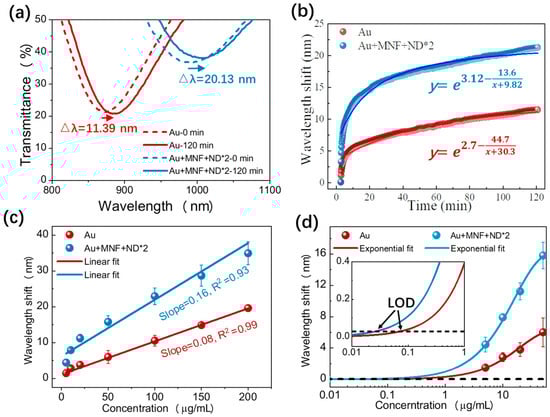(a) Transmission spectra of the Au and Au + MNF + ND*2 chips incubated with 150 μg/mL goat-anti-mouse IgG solution at 0 and 120 min. (b) Real-time resonant wavelength shift during incubation. (c) Wavelength shifts of the two chips at varied mouse IgG concentration solutions. (d) Exponential fits at low concentration range.