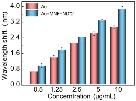 Porcine pseudorabies caused by PRV is an acute septic epidemic to which livestock and wildlife are susceptible, and developing a detection method for the diagnosis of wild-type PRV infection is important []. Here, our proposed SPR sensing scheme has also been demonstrated for sensitivity-enhanced PRV detection in a serum environment. PRV antibody was immobilized on the chip surface for immunoassay of PRV. The Au and Au + MNF + NDs*2 chips were incubated with 40 μg/mL PRV antibody for 60 min. The resonant wavelength shifts over time are shown in Figure S5. As similar to the case of goat-anti-mouse IgG, the PRV antibody immobilization-induced shift amount for Au + MNF + NDs*2 chip (11.49 nm) was larger than that for the Au chip (8.02 nm). Then, the two chips were incubated with different concentrations of PRV in serum solutions. The redshifts at different concentrations from 0.5 to 10 μg/mL were presented in Figure 8. Both chips perform an accumulated increase of resonant wavelength shift as the increase of concentration. Moreover, the Au + MNF + NDs*2 chip shows more redshift amount at each concentration. As a result, the LOD was lowered from 0.024 μg/mL (Au chip) to 0.018 μg/mL (Au + MNF + ND*2 chip), which was far lower than the proposed result by direct immunoassay of PRV [].