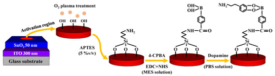 To fabricate the EG sensing unit, a glass substrate (1.5 cm × 2.5 cm) was used. We deposited a 300 nm thick ITO conductive layer and a 50 nm thick SnO2 sensing layer using RF magnetron sputtering. The ITO conductive layer was electrically connected to the Al top-gate electrode of the SOI DG FET using an electrical cable. The surface potential of the analytes was sequentially transferred from the SnO2 sensing layer to the ITO conductive layer and top-gate electrode of the transducer unit. To function as a DA-sensitive membrane, the SnO2 sensing layer underwent several surface functionalization steps. Prior to surface functionalization, we defined an activation region (0.6 cm diameter) on the center of the sensing membrane by attaching a PDMS reservoir. Thereafter, the substrate was subjected to O2 plasma treatment for cleaning, which resulted in the formation of OH groups on its surface. Then, we introduced amine groups to the surface using 5% (v/v) APTES in ethanol solution. The substrate was immersed in the solution at room temperature for 11 min and gently rinsed with ethanol and DI water, after which it was dehydrated in an oven at 70 °C for 1 h to firm the crosslinks on the surface. The substrate was then immersed in a solution of 4-CPBA activated with EDC and NHS in 1 mM MES buffer solution (4-CPBA:EDC:NHS = 1:1:1 mM). We dropcasted 50 μL of 4-CPBA, EDC, and NHS on the surface and kept it at room temperature until all the solution had evaporated. The 4-CPBA acts as a DA receptor since the phenylboronic-acid in it combines with the 1,2- or 1,3-diols of DA and produces reversible covalent bonding [26,27,28]. EDC merges with the carboxyl group of 4-CPBA and forms O-acylisourea [29]. To avoid the hydrolysis reaction that prohibits the amine-carboxyl coupling between the O-acylisourea and amine group, we added NHS solution; NHS attached to the O-acylisourea and produced a stable synthetic NHS ester [30]. After all liquid had evaporated, the activated surface was sequentially rinsed with 10 mM MES buffer solution and DI water. Finally, DA was immobilized on the functionalized surface with dynamic concentrations between 10 fM and 1 μM. DA solutions were prepared by diluting DA hydrochloride in PBS solution (pH 7.4). The process flow of the surface functionalization is depicted in Figure 2.