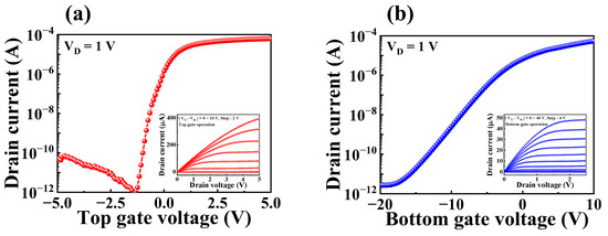 The proposed biosensor platform comprised transducer and sensing units. The transducer unit was fabricated on a SOI substrate using a DG structure FET. The sensing performance of the FET-type sensor platform is dependent on the electrical characteristics of the transducer unit. To assess the electrical characteristics of the SOI DG FET transducer unit, transfer and output characteristics were measured. During the electrical characterizations, either the top- or bottom-gate electrode was biased while the other gate electrode was grounded. Figure 3a and b represent the transfer characteristic (IDS-VG) curves for top-gate and bottom-gate operations of the SOI DG FET transducer device, respectively. These transfer characteristics curves were measured with a drain voltage (VD) of 1 V while sweeping the top- and bottom-gate voltage from −5 to 5 V and −20 to 10 V, respectively. The output characteristics (IDS-VD) for top- and bottom-gate operations—which are shown in the insets of Figure 3a and b—were measured by sweeping VD from 0 to 2.5 V and 0 to 5 V, respectively, while changing the voltages of the two gates from 0 to 40 V and 0 to 10 V, respectively.
