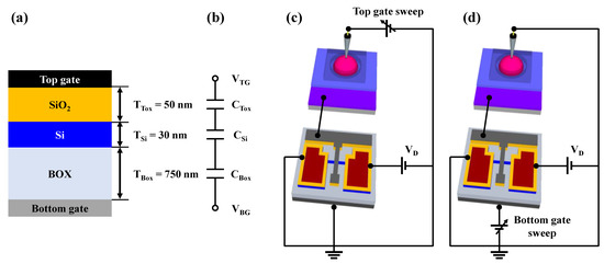 Figure 4a illustrates the metal-oxide-semiconductor capacitor (MOSCAP) structure, excluding the S/D electrodes, and Figure 4b shows the electrical equivalent circuit of the SOI DG FET transducer unit. In SG operation mode, during which the FET operated using only the top-gate electrode (Figure 4c), sensitivity was not amplified due to the absence of capacitive coupling. However, in DG operation mode, during which the FET operated using the bottom-gate electrode (Figure 4d), sensitivity was amplified based on the capacitance ratio between the top- and bottom-gate electrodes.