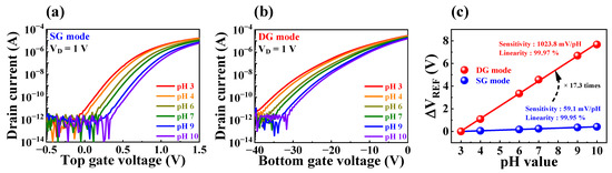 Transfer characteristics curves with varying pH values during (a) SG mode and (b) DG mode of the proposed biosensor. (c) pH sensitivity in the SG and DG modes.