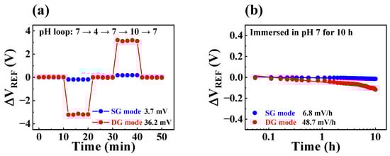 (a) Hysteresis effect and (b) drift effect in SG and DG modes of the fabricated device.