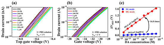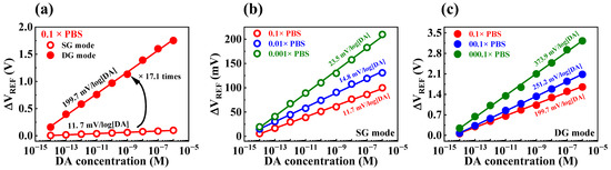 Transfer characteristics curves with varying DA concentration in (a) SG mode and (b) DG mode. (c) DA sensitivity in SG mode and DG mode.