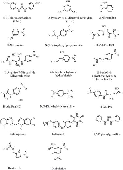 NIC, 4-nitroaniline, 2-nitroaniline, 3-nitroaniline, N-(4-nitrophenyl) propionamide, H-Val-pNA HCl, L-argininep-nitroanilide dihydrochloride, 4-nitrophenethylamine hydrochloride, N-methyl-4-nitrophenethylamine hydrochloride, H-Ala-pNA HCl, N, N-dimethyl-4-nitroaniline, H-Glu-pNA, halofuginone, toltrazuril, 1,3-diphenylguanidine, ronidazole, and dinitolmide were obtained from Sigma-Aldrich (St. Louis, MO, USA) (Figure 1). The coating antigen (DNC-4-BSA) and mAb 3B4 were acquired from China Agricultural University (Qianqian Tang May 2018). For other reagents materials were shown in the Supplementary Materials part.